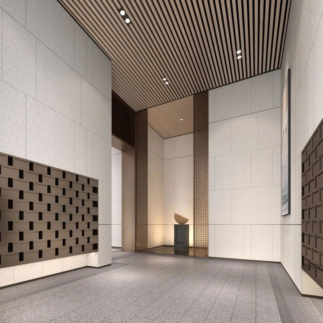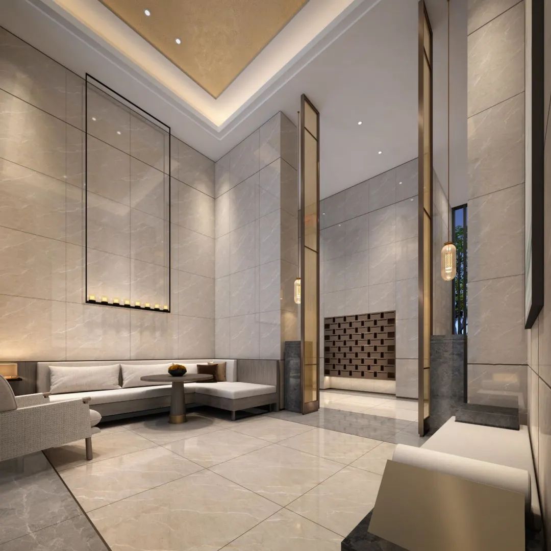 信達秦禾·金尊府項目設(shè)計范圍包含樣板間、首層入戶大堂以及架空層,其中入戶大堂采用半開放式設(shè)計和園林相輔相成,外展區(qū)設(shè)置信報箱、快遞柜等功能空間。考慮到業(yè)主短暫休憩的需求,設(shè)置了休息區(qū)、公告欄以及主題墻等區(qū)域,讓公共空間美觀實用且具有品質(zhì)感。