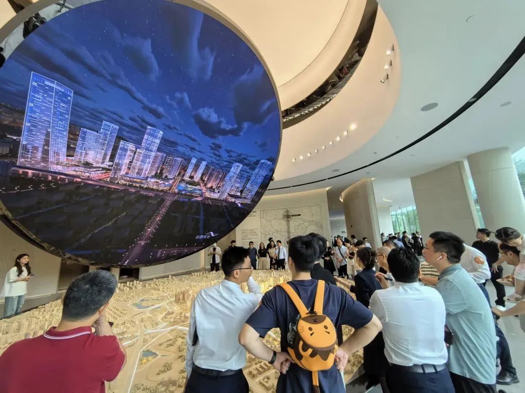 同時也設有精心設計的圖文展示墻,詳細記錄了長隆萬博片區的發展歷程和未來規劃,從萬博片區到項目自身,層層遞進,即使非廣州本地人也能迅速了解板塊情況。從一樓,可以清晰看到番禺的發展,看到萬博CBD從1.0到3.0的一路進化與迭代。從2006年萬博商務區概念面世,再到2013年控規獲批,直至2023年完成擴容。擴容后的萬博商務區,由1.5平方公里擴展至7.2平方公里,涵蓋漢溪長隆、萬博、里仁洞三大板塊,并統稱為“廣州南CBD”。360°沉浸式影廳,給大家描繪萬博未來城市的生活方式。