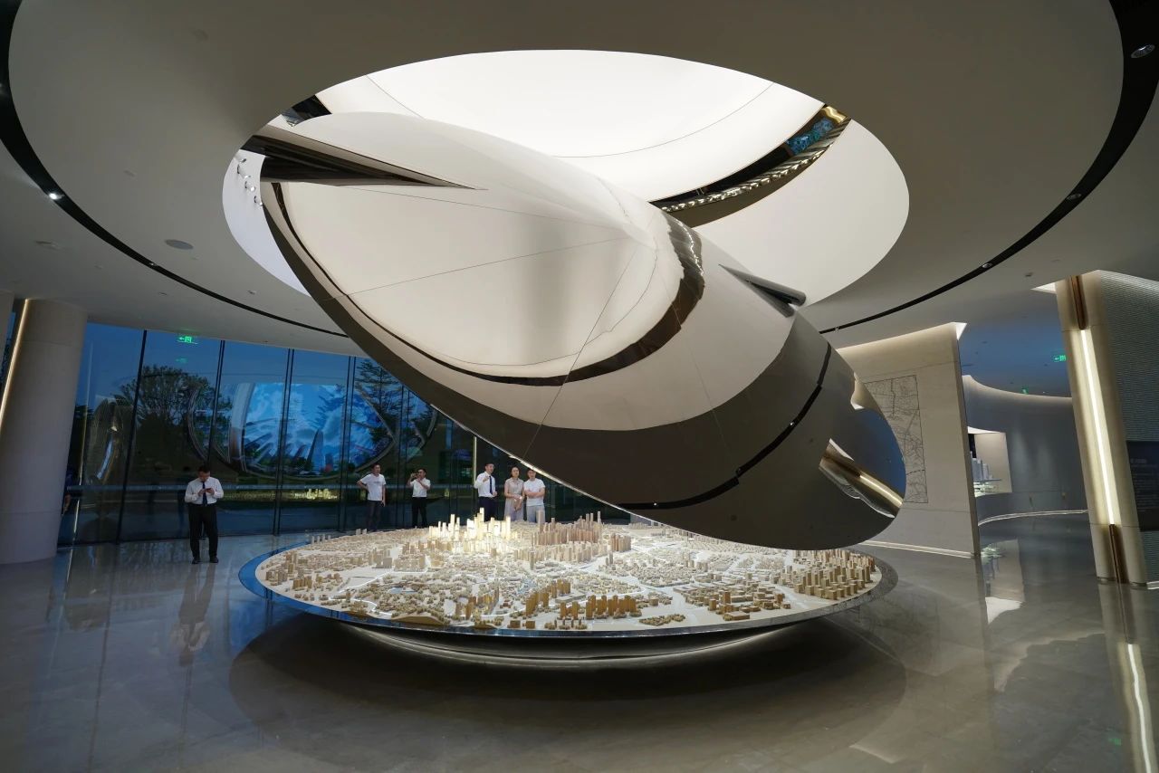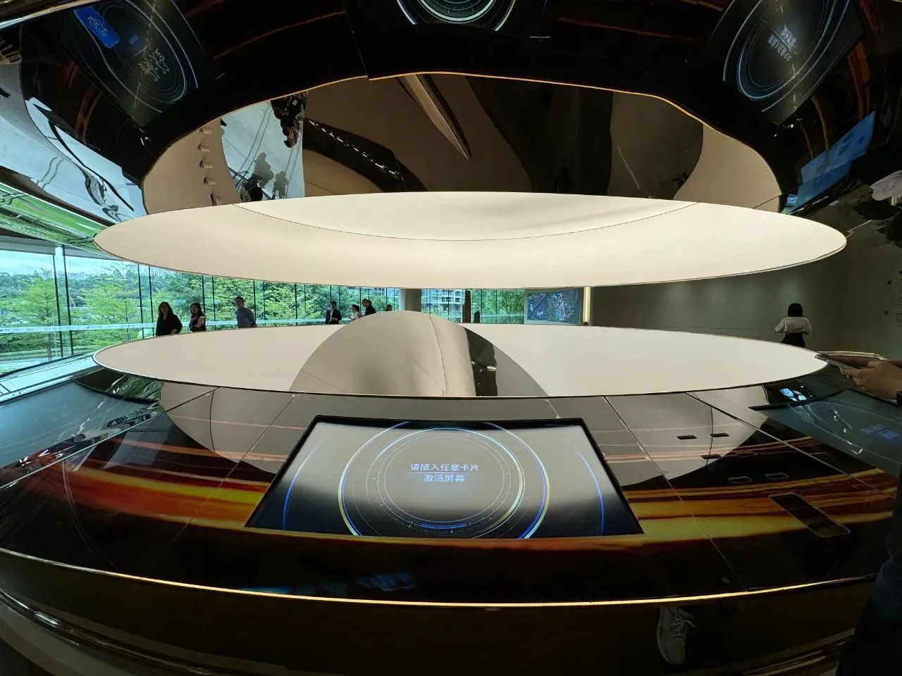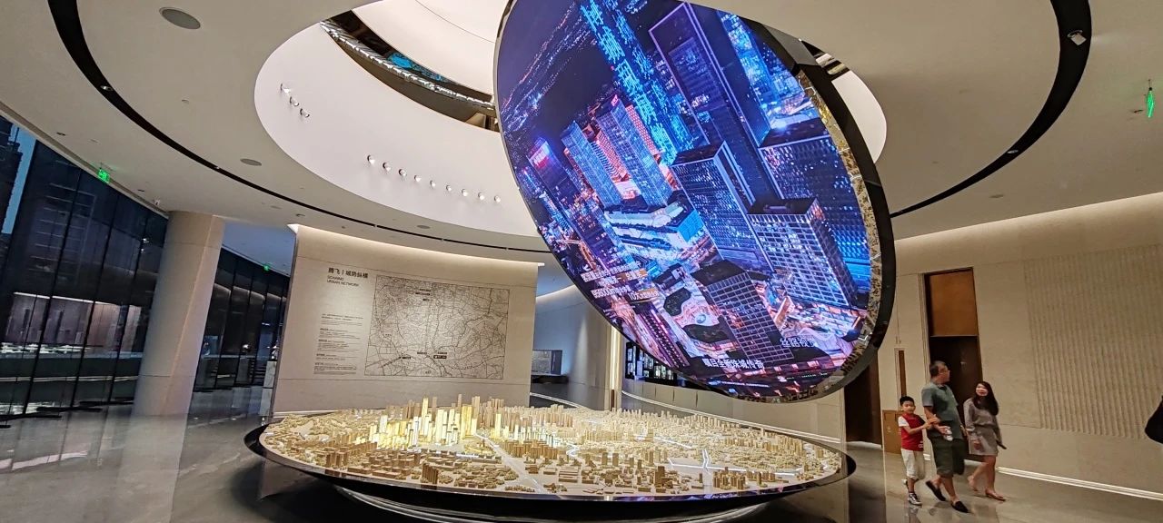展廳內大量運用全息投影、弧形巨屏等高科技手段,呈現極具科技感的氛圍,提供了科技與藝術融合的沉浸式體驗,包括大氣震撼的懸吊式巨型LED沙盤、沉浸式影院的視覺體驗等。展廳外圍以烏托邦IP為主題街道藝術插件,將松弛感與藝術感融入每個角落,為參觀者帶來前所未有的輕松與自在感。