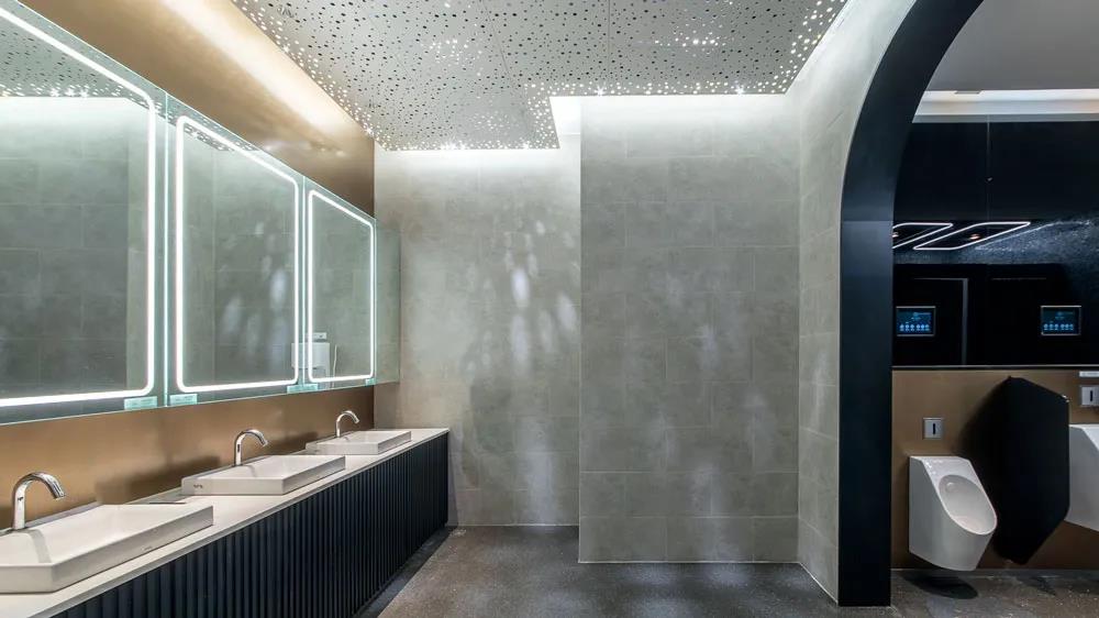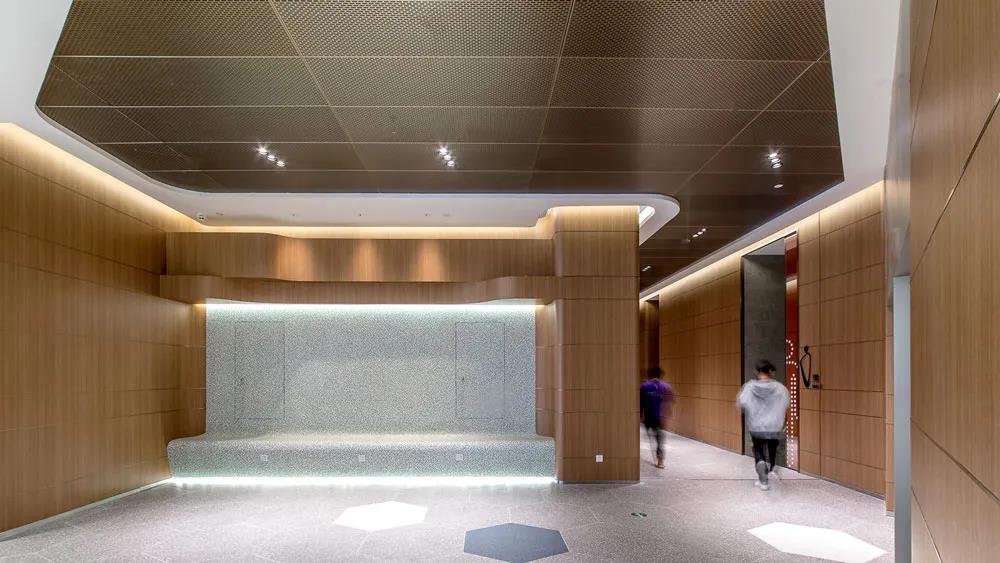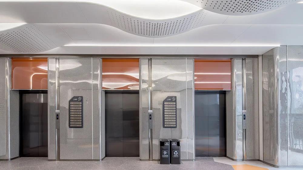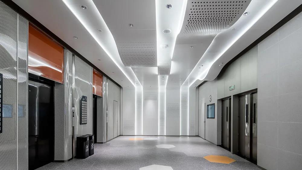 在次要空間中,衛生間和電梯廳都延續了生長的概念,通過現代時尚的弧形邊角處理,形成一種微妙的科技感,局部點綴的色彩,使空間增加了年輕的氛圍。