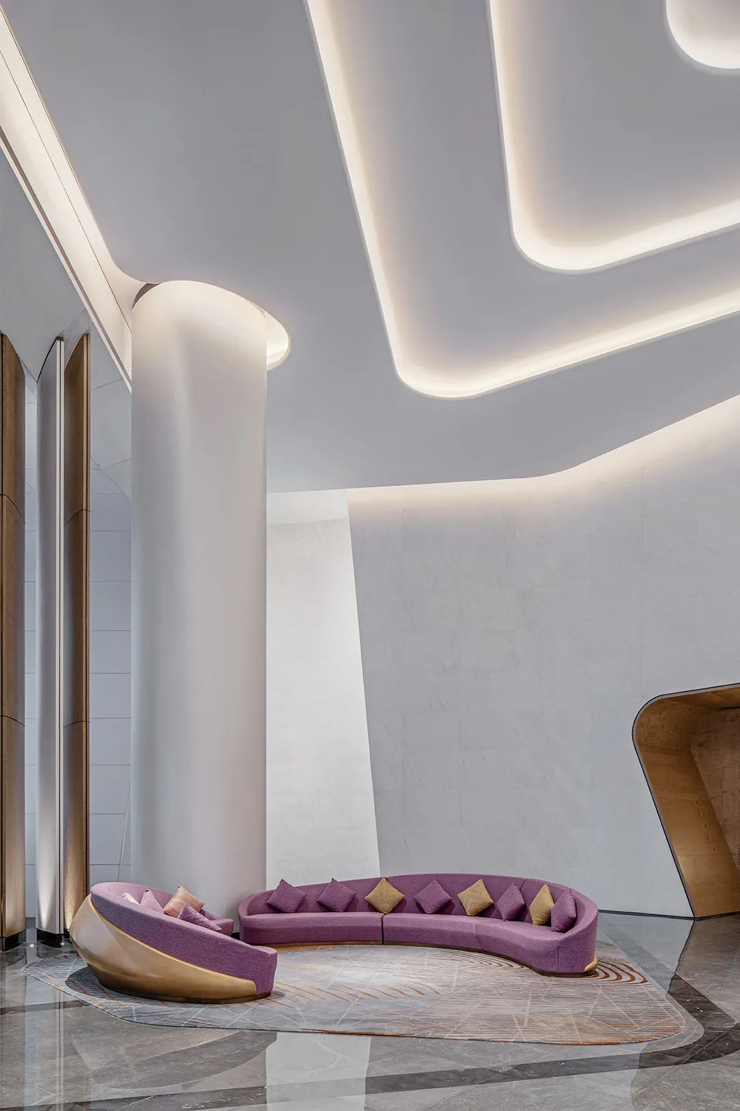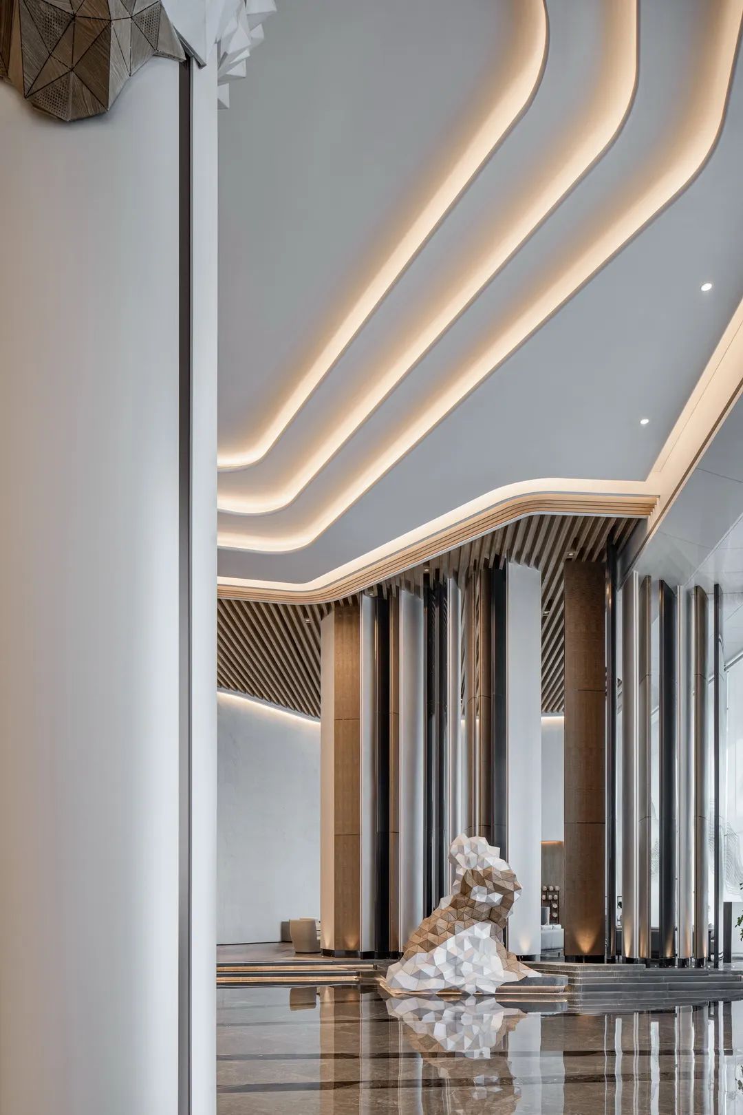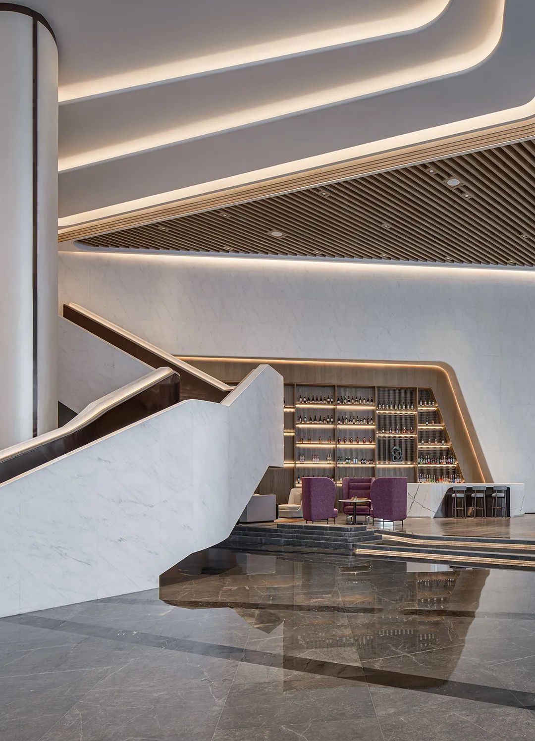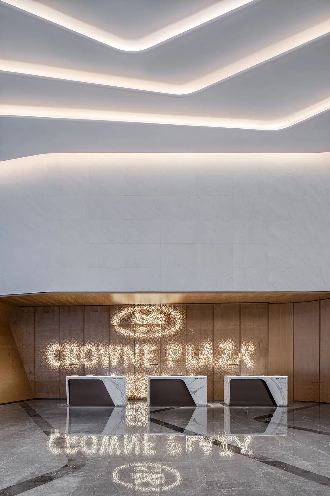 凝視是一種無意識的觸摸。與皇冠假日酒店的第一次對視,你會讀取到清晰的輪廓、升騰的秩序和流暢的線面結構。進入大堂,均質(zhì)的釉白從穹頂蔓延,蕩出層層硬朗漣漪,向下勻速流動,圍合成弧形墻體,曲面廊梯。