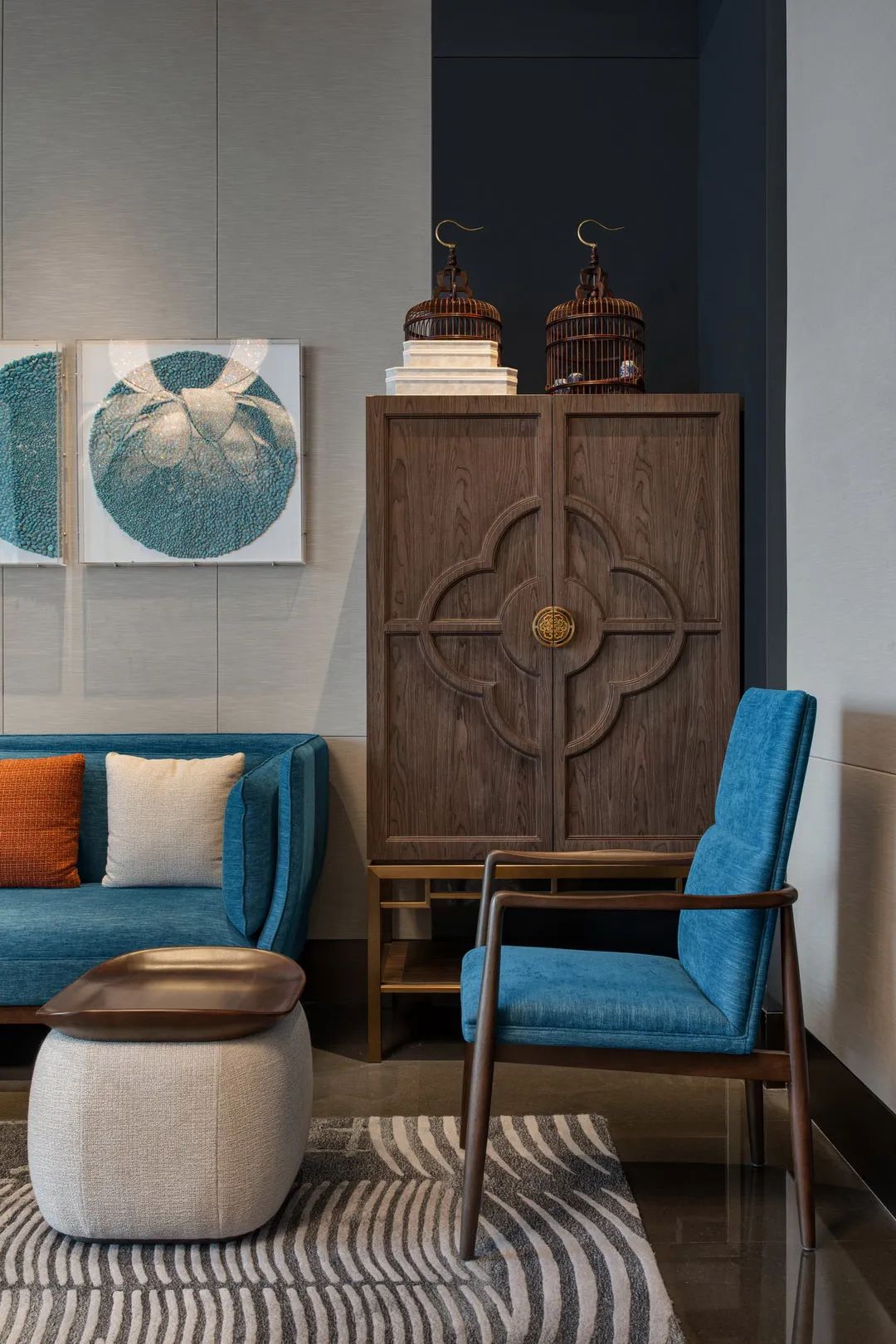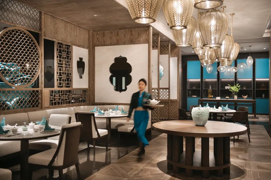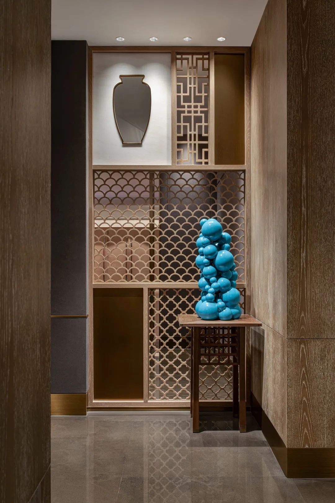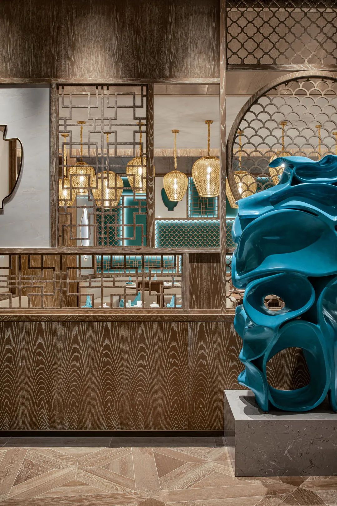 裸露的深棕原木紋理,由墻鋪展桌椅、邊柜、花窗,精心設計的燈光或隱或現(xiàn),令人倍感溫潤與親密。高瓷藍點綴流線雕塑、黃銅把手及布藝沙發(fā);松石綠暈染如玉燈光壁、星砂裝飾畫……幽暗氛圍中,雙色交相輝映,如千里江山圖里的只此青綠,韻味無窮。