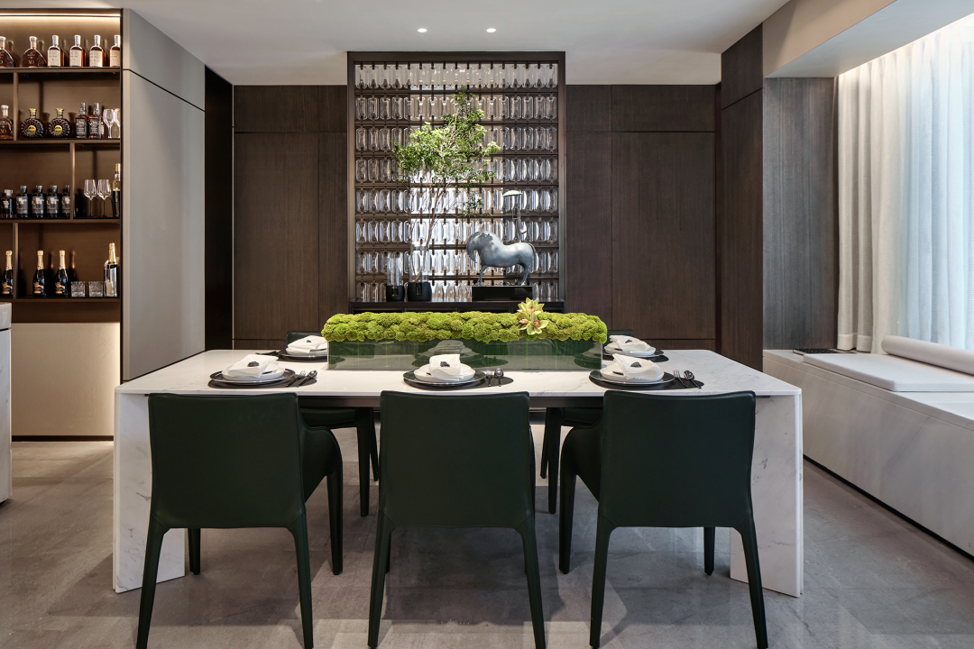 餐廳摒棄常規餐桌的形式,搭配以穿插的構造手法巧妙設置的中島吧臺,營造一種西廚場景,形成客餐廳聯通的中西廚格局。此外,客廳與吧臺、餐廳的開敞聯合,也有效拓展了公共區域的活動范圍與分區層次。