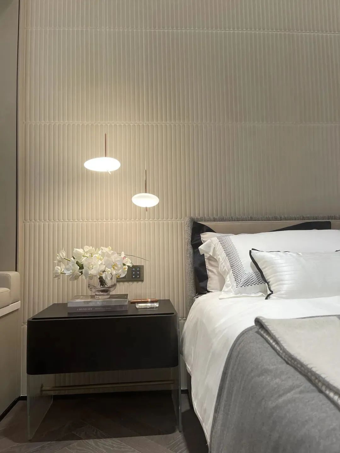 主臥在自然光照的洗禮下整體呈現柔和的色調,搭配一束綠植,空間充滿了輕松愜意的氛圍,更是流露出有別于現代主義冷冽的溫馨感。