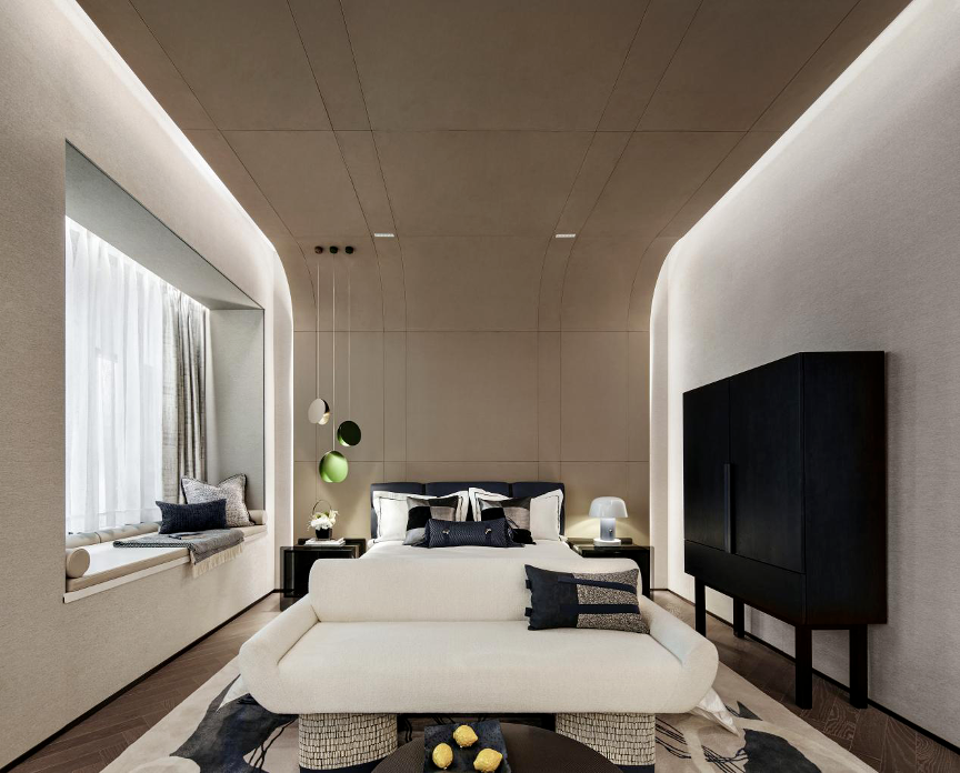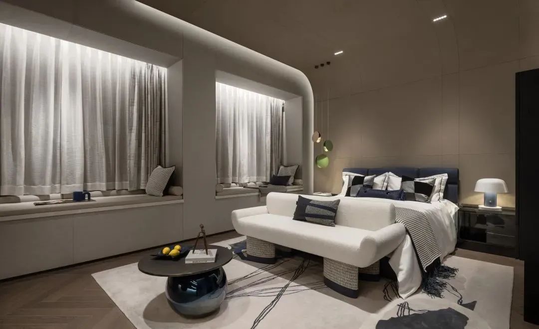 客臥由灰調鋪陳,傳達出溫情而平和的情緒。靛藍的床頭背板,與灰色系墻面和諧交融,烘托出自然沉穩而不失高貴的氣場。床尾圓形茶幾的加入,呈現方中有圓、圓中有方的組合形態,配合地毯上的藝術畫作,讓一抹優雅回蕩其間。