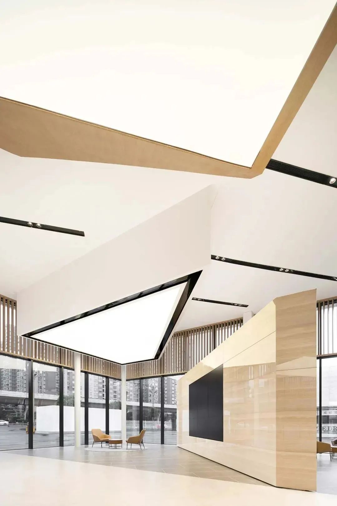 本項目注重“公共性”和“開放性”,將建筑景觀界面延伸交錯的線性延伸至室內天花、吧臺、樓梯斜切面,統一的線性交錯特征,打破了功能空間的固定關系,將不同屬性的功能空間聯系起來,形成室內與戶外的互動對話。